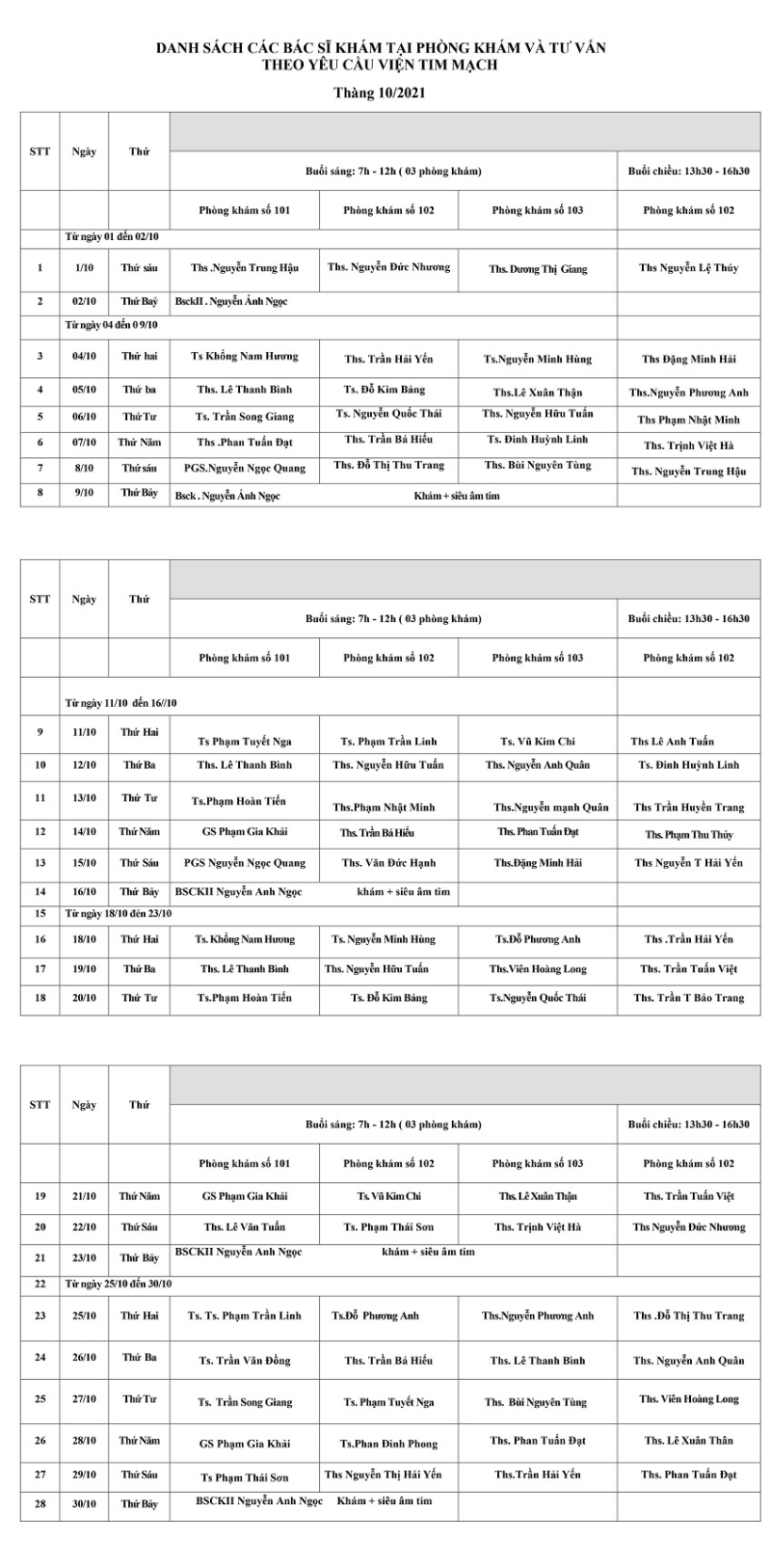 Lịch khám và tư vấn theo yêu cầu tháng 10 -2021