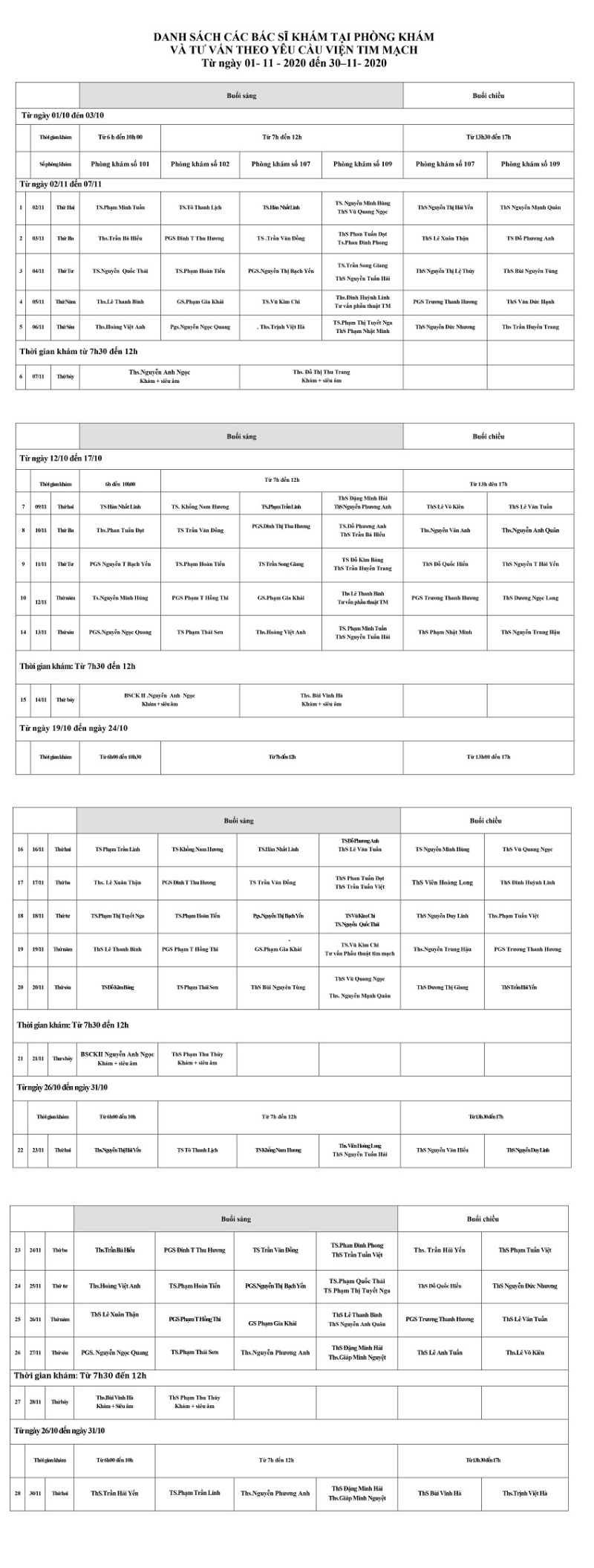 Lịch khám và tư vấn theo yêu cầu tháng 11 -2020