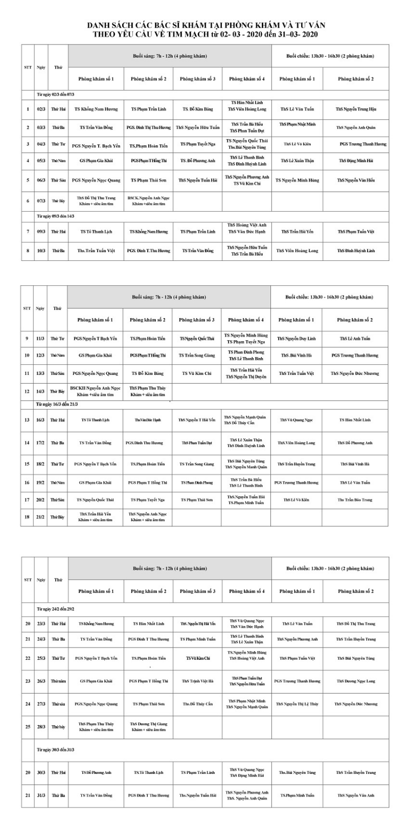 Lịch khám và tư vấn theo yêu cầu tháng 3 - 2020