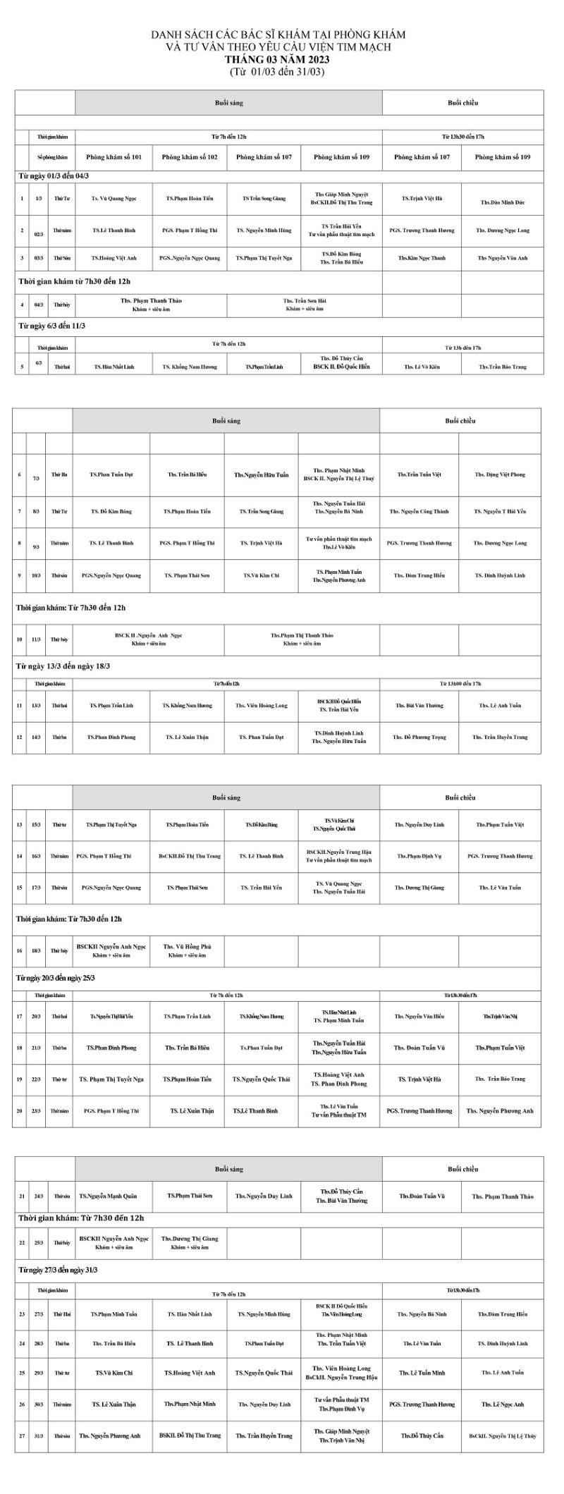 Lịch khám và tư vấn theo yêu cầu tháng 3 - 2023