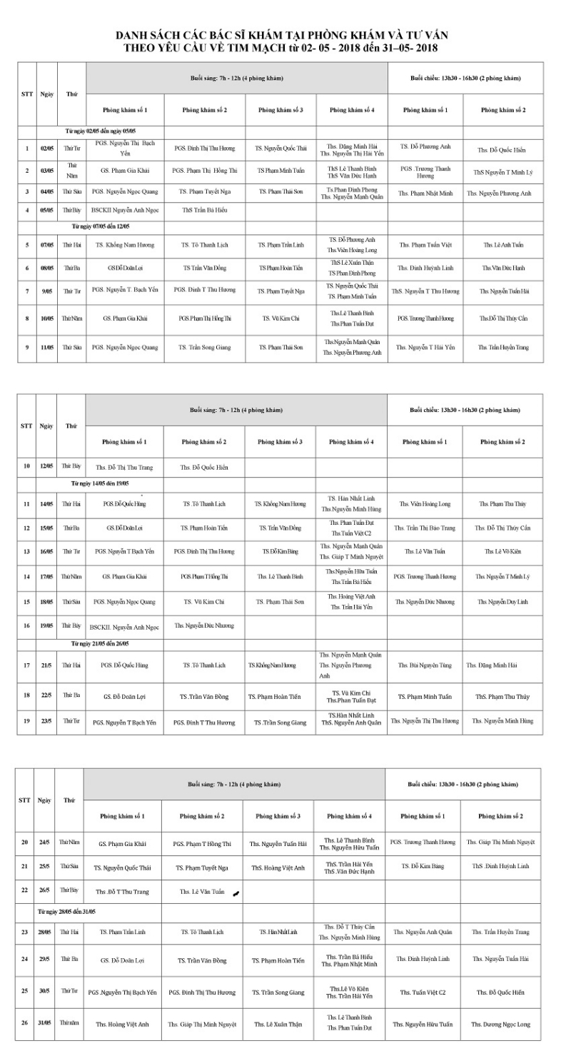Lịch khám và tư vấn theo yêu cầu tháng 5 - 2018