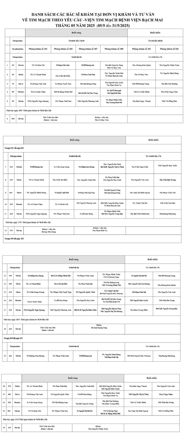 Lịch khám và tư vấn theo yêu cầu tháng 5 - 2025