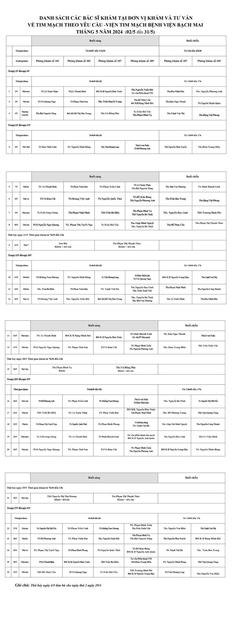 Lịch khám và tư vấn theo yêu cầu tháng 5 -2024