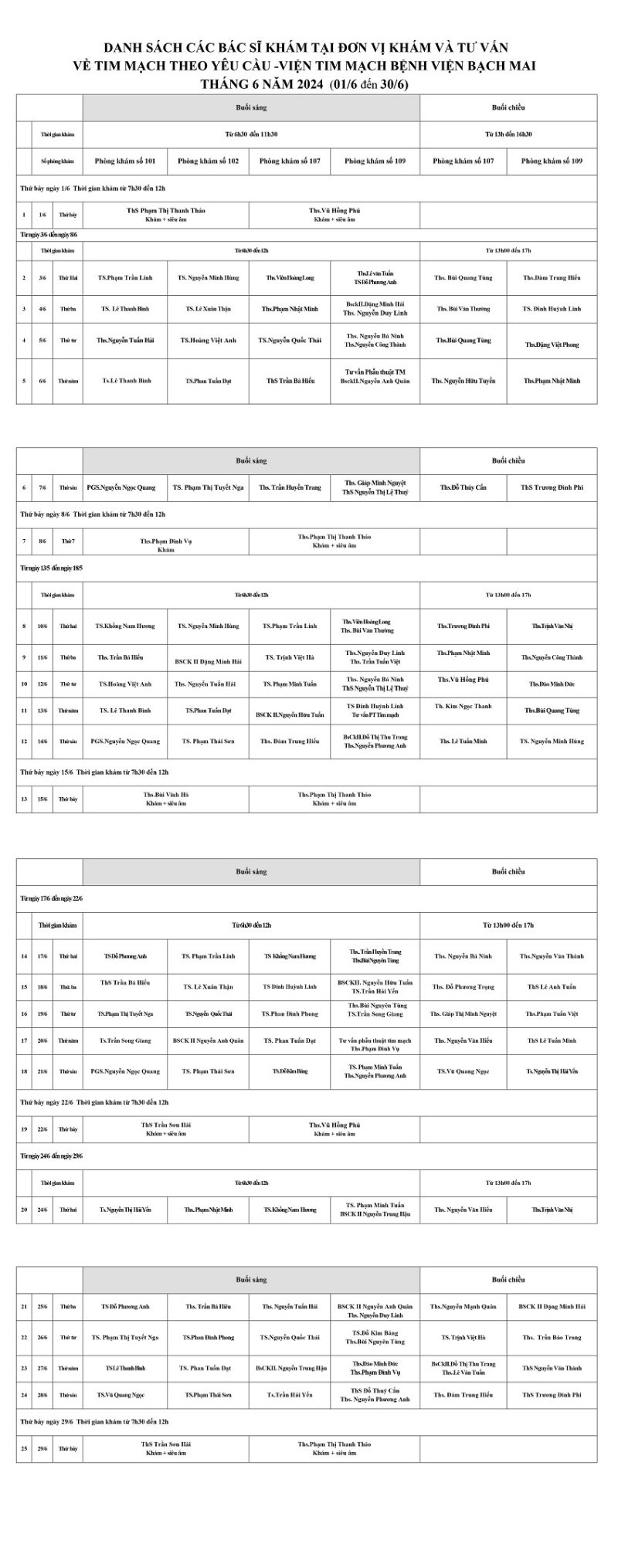 Lịch khám và tư vấn theo yêu cầu tháng 6 -2024