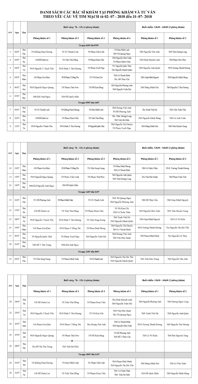 Lịch khám và tư vấn theo yêu cầu tháng 7 - 2018