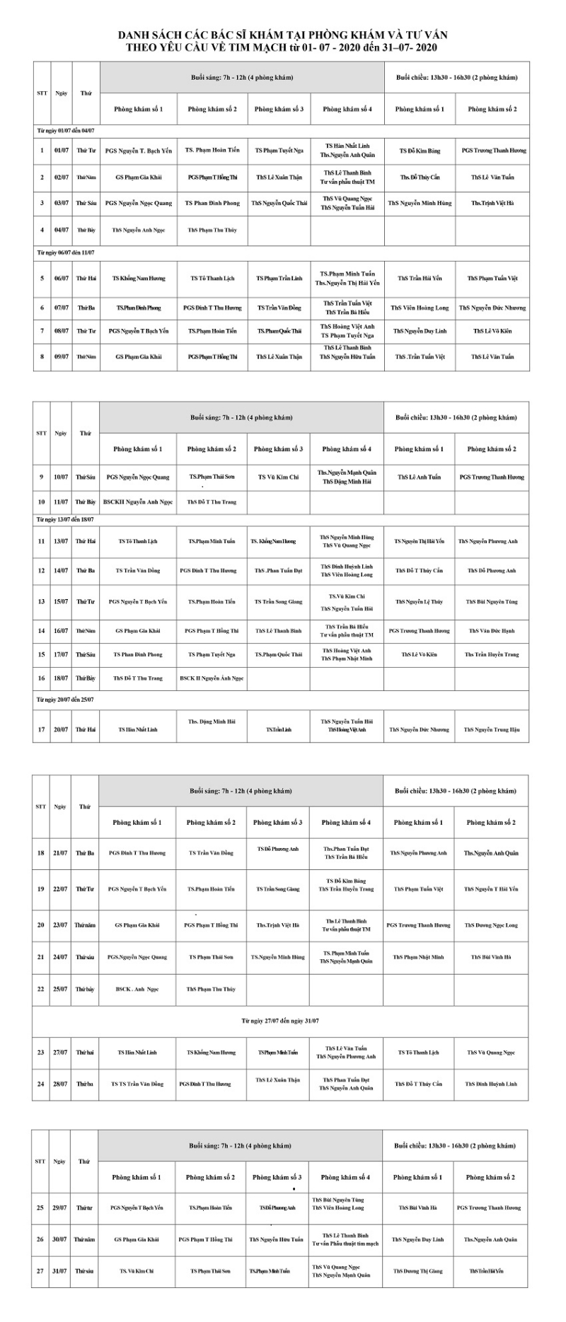 Lịch khám và tư vấn theo yêu cầu tháng 7 -2020