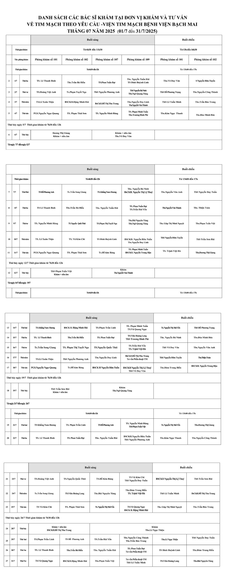 Lịch khám và tư vấn theo yêu cầu tháng 7- 2025