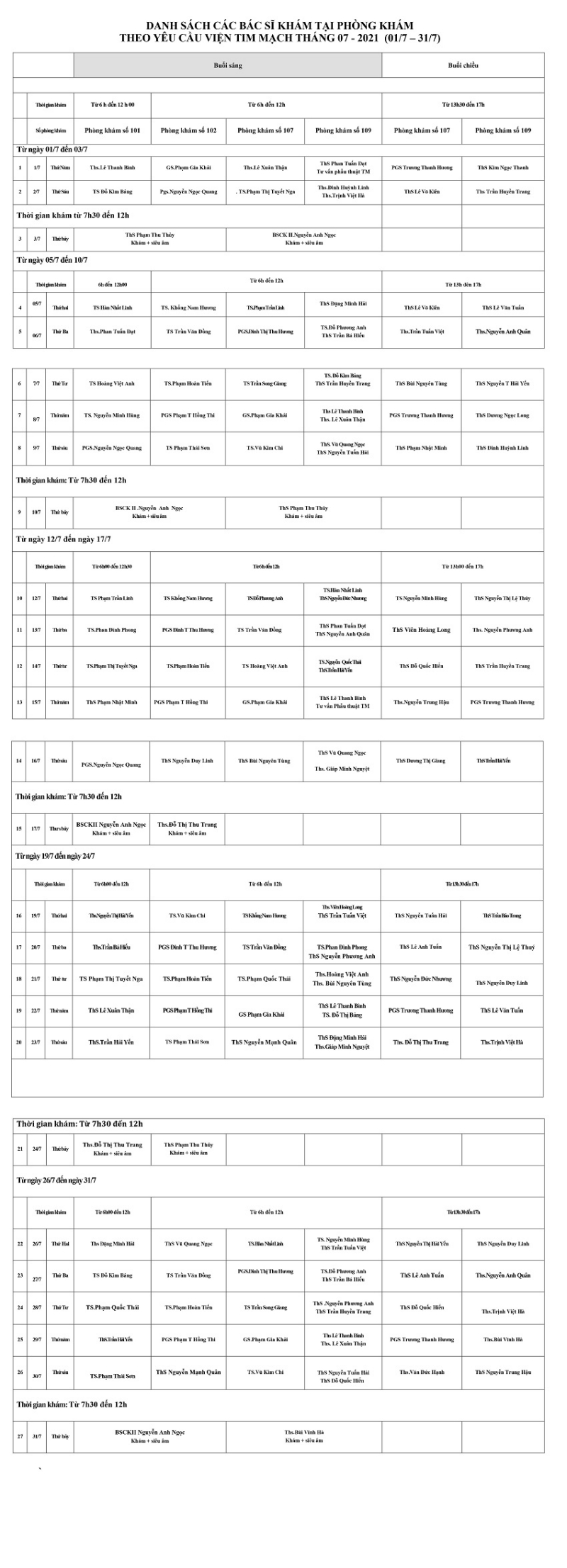 Lịch khám và tư vấn theo yêu cầu tháng 7-2021