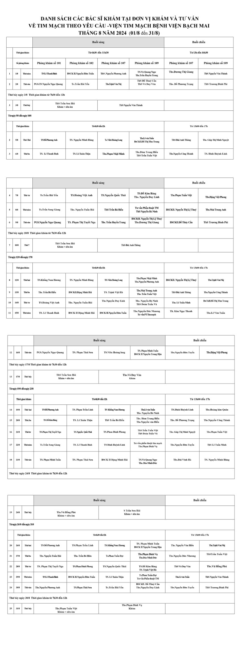 Lịch khám và tư vấn theo yêu cầu tháng 8 - 2024