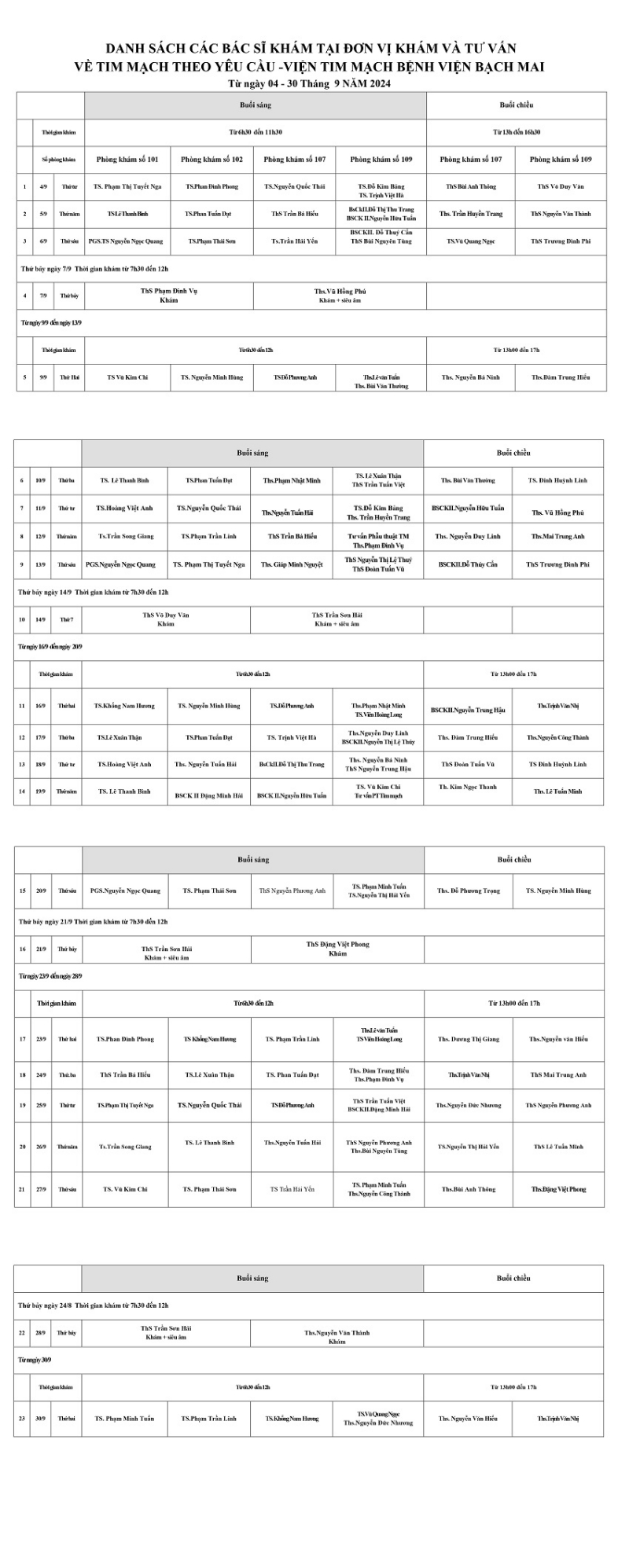 Lịch khám và tư vấn theo yêu cầu tháng 9 - 2024 Tweet Căn cứ tại Công điện 87/CĐ-TTg năm 2024, Bão số 3 được dự báo có cường độ rất mạnh, mức độ rủi ro thiên tai lớn, diễn biến phức tạp,Viện Tim mạch thông báo tạm dừng lịch khám yêu cầu sáng thứ 7, ngày 7/9/2024,Trân trọng,