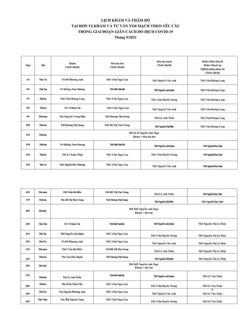 Lịch khám và tư vấn theo yêu cầu tháng 9-2021