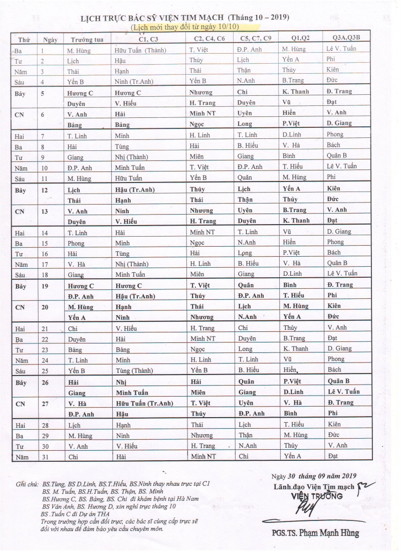 Lịch trực chuyên môn tháng 10 - 2019