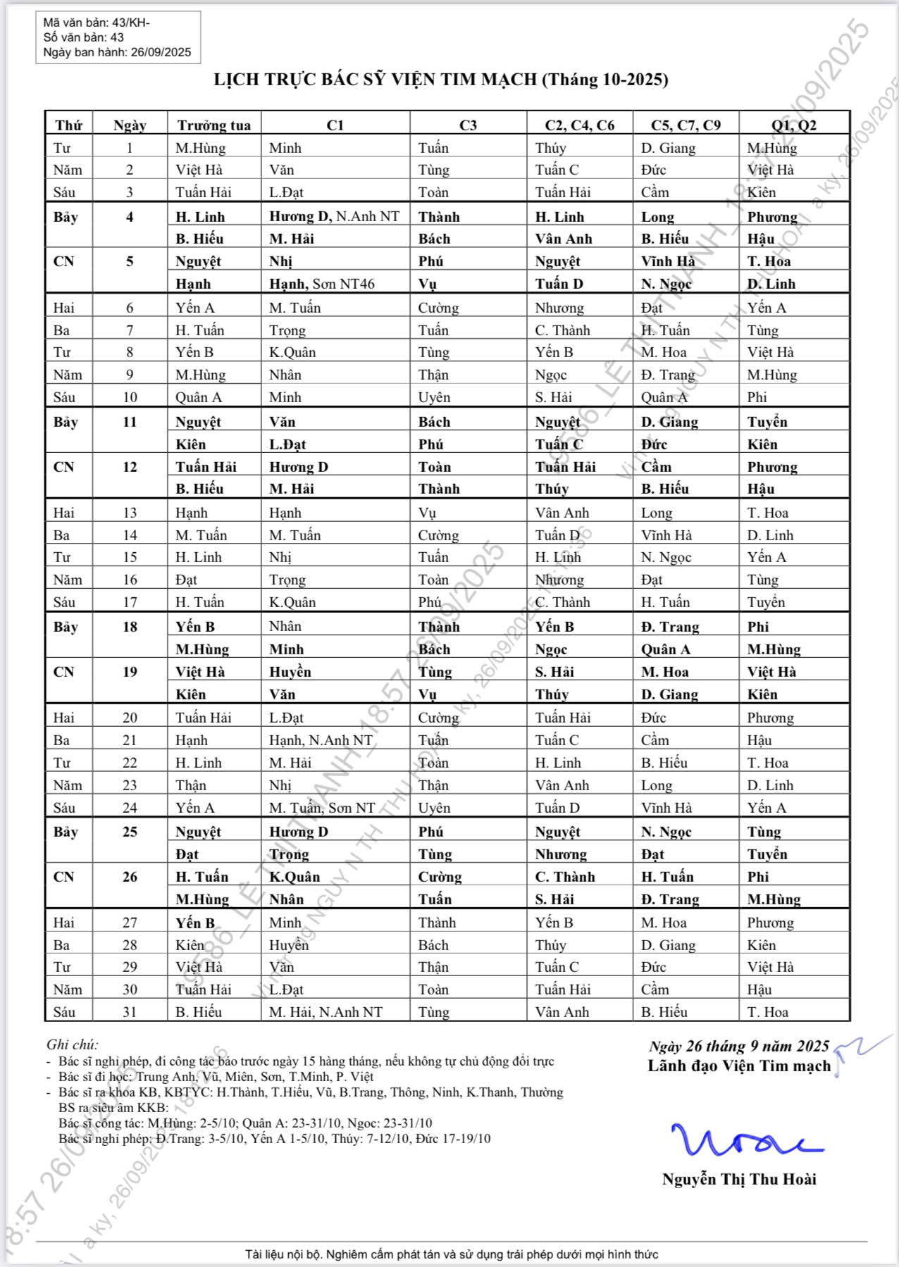 Lịch trực chuyên môn tháng 10 - 2025
