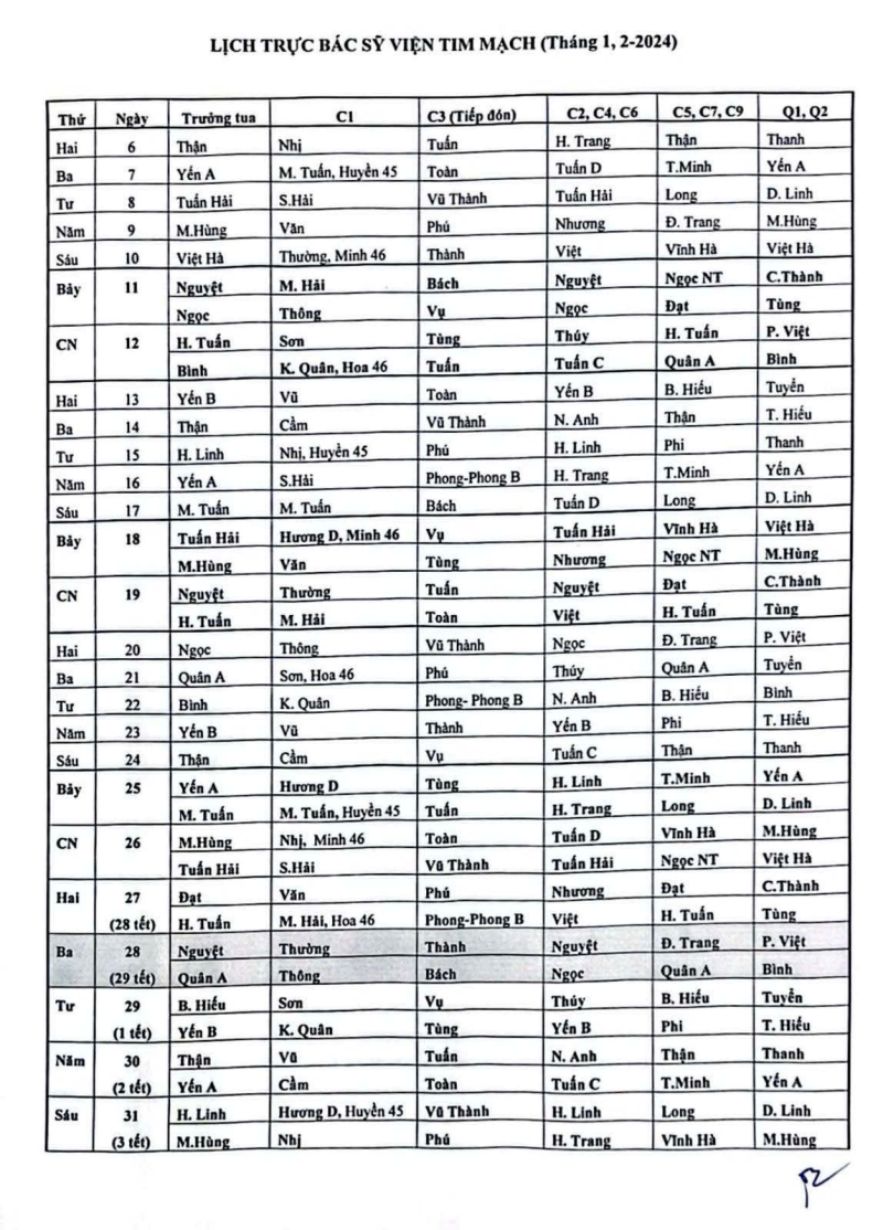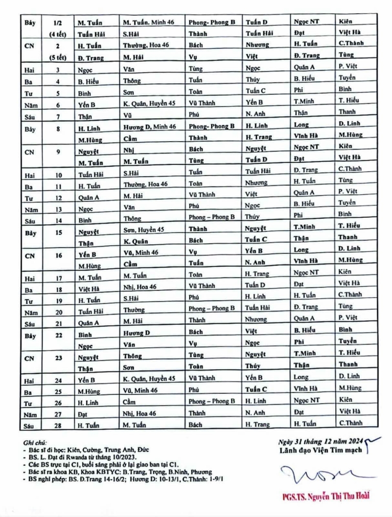 Lịch trực chuyên môn tháng 1,2 - 2025