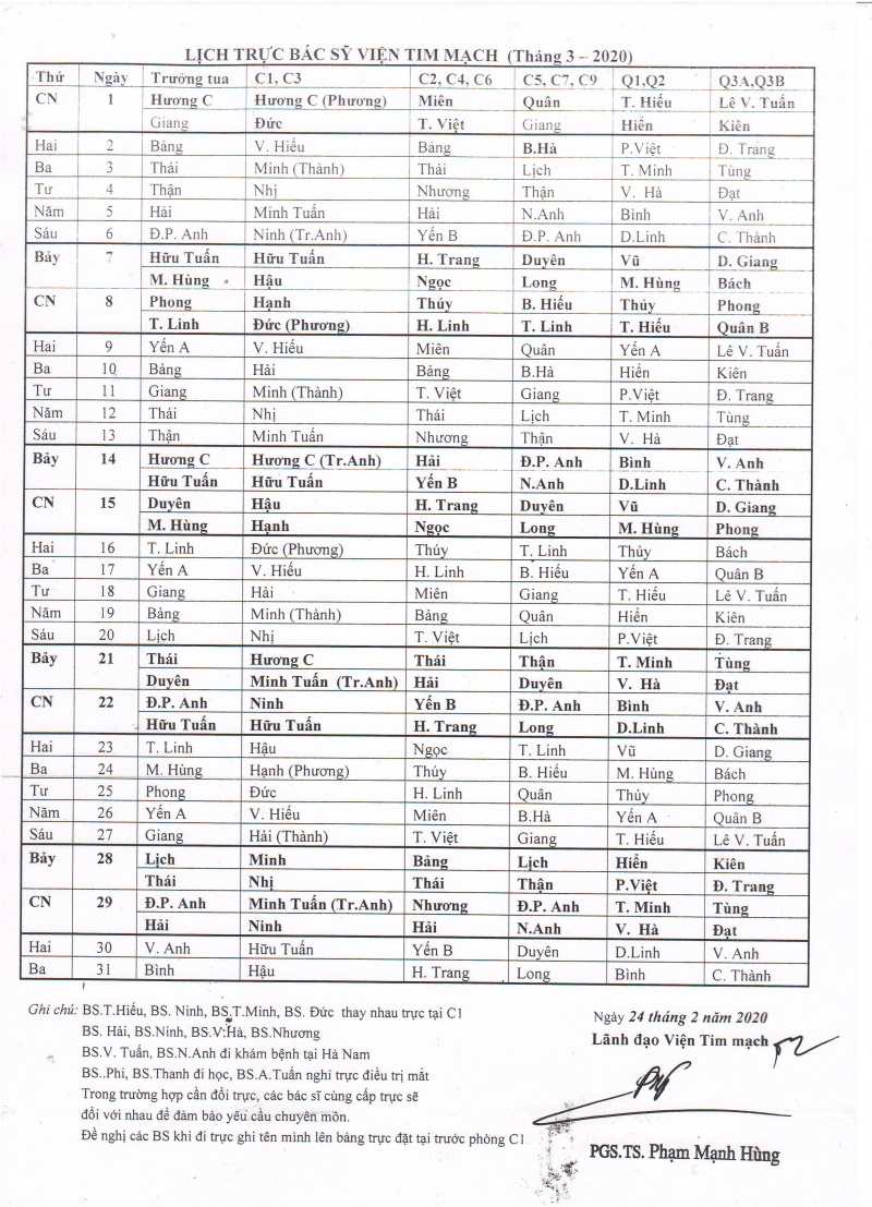 Lịch trực chuyên môn tháng 1,2 - 2020