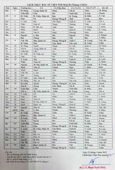 Lịch trực chuyên môn tháng 4 - 2023