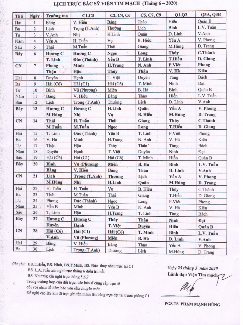 Lịch trực chuyên môn tháng 6 - 2020