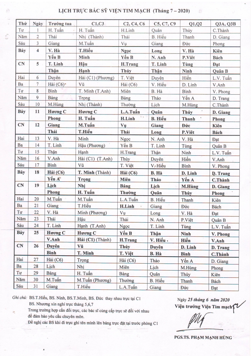 Lịch trực chuyên môn tháng 1,2 - 2020