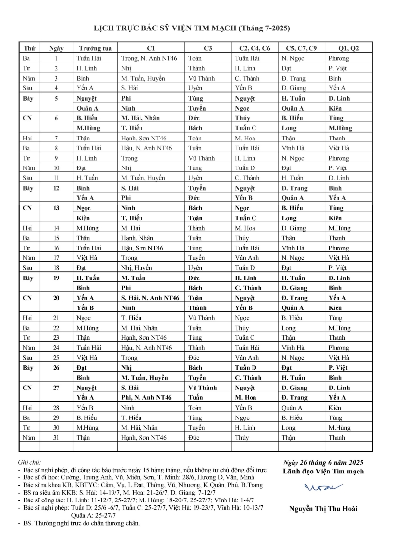 Lịch trực chuyên môn tháng 7 - 2025