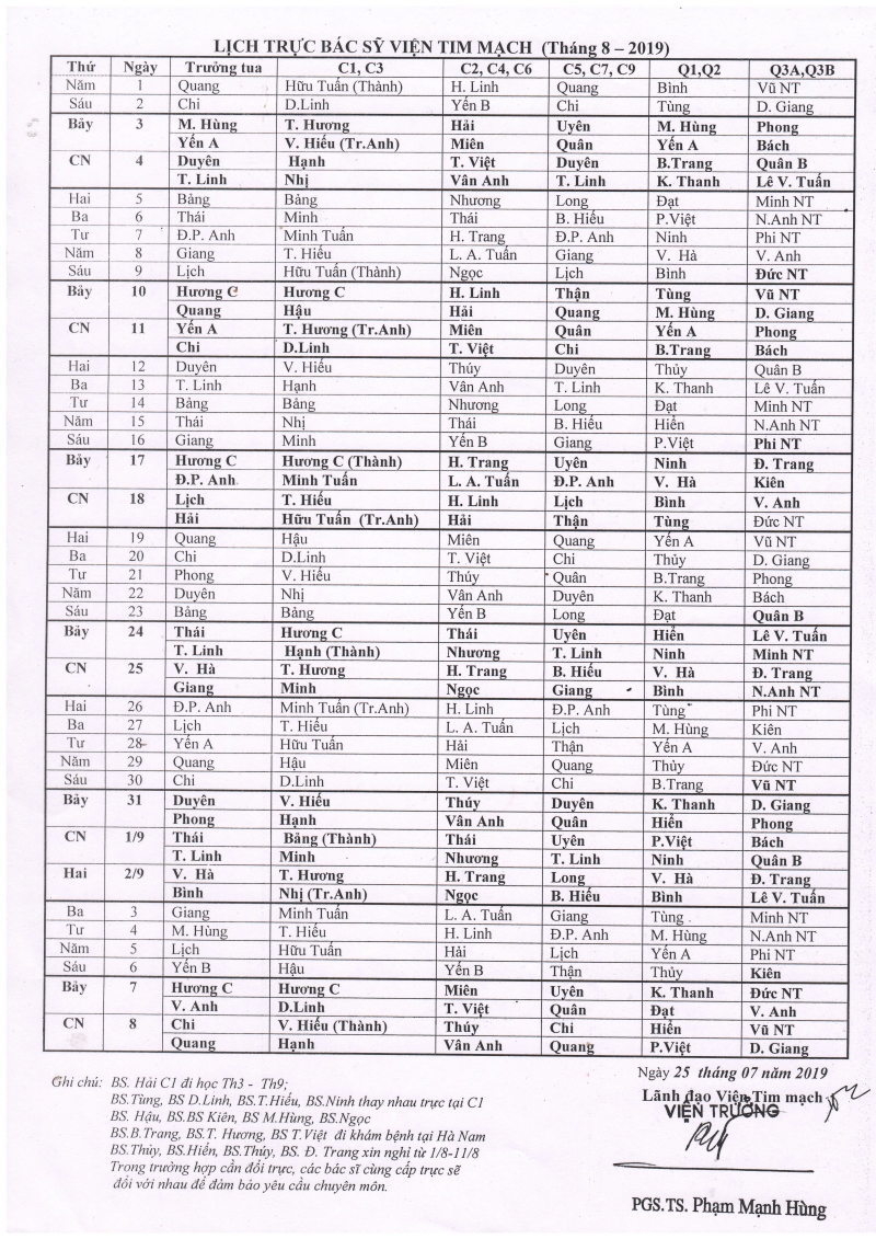 Lịch trực chuyên môn tháng 8- 2019