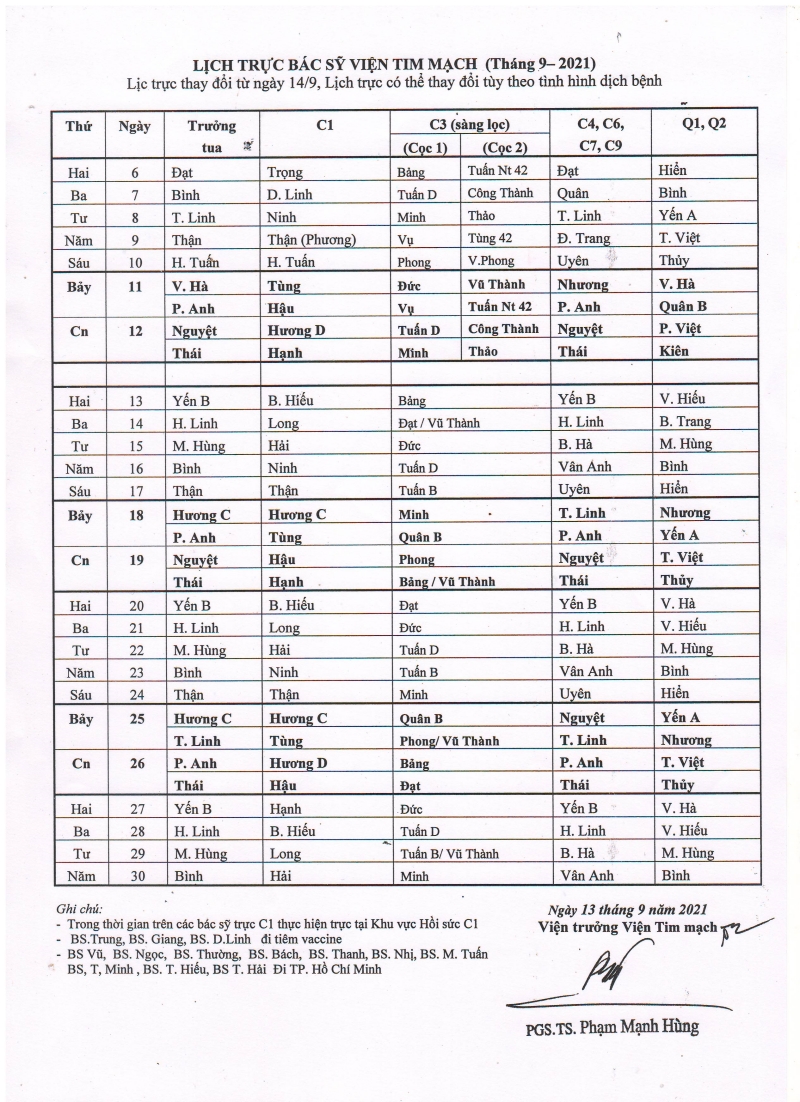Lịch trực chuyên môn tháng 9 - 2021