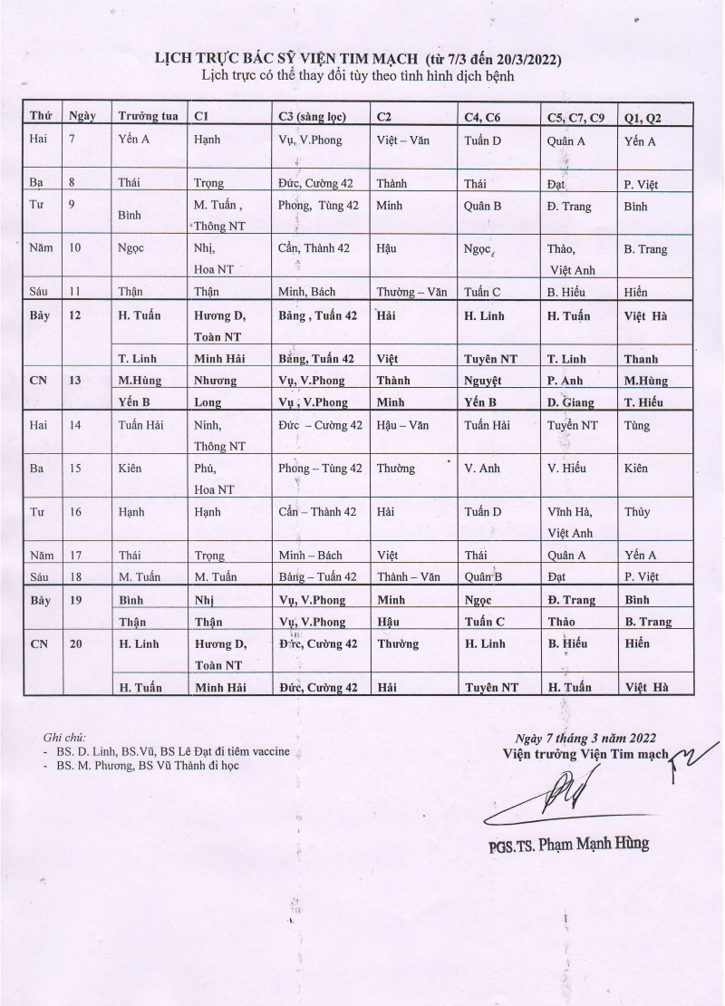 Lịch trực chuyên môn từ 07/03/2022 đến 20/03/2022
