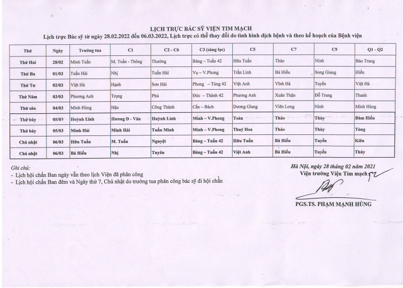 Lịch trực chuyên môn từ 28/2/2022 đến 06/03/ 2022