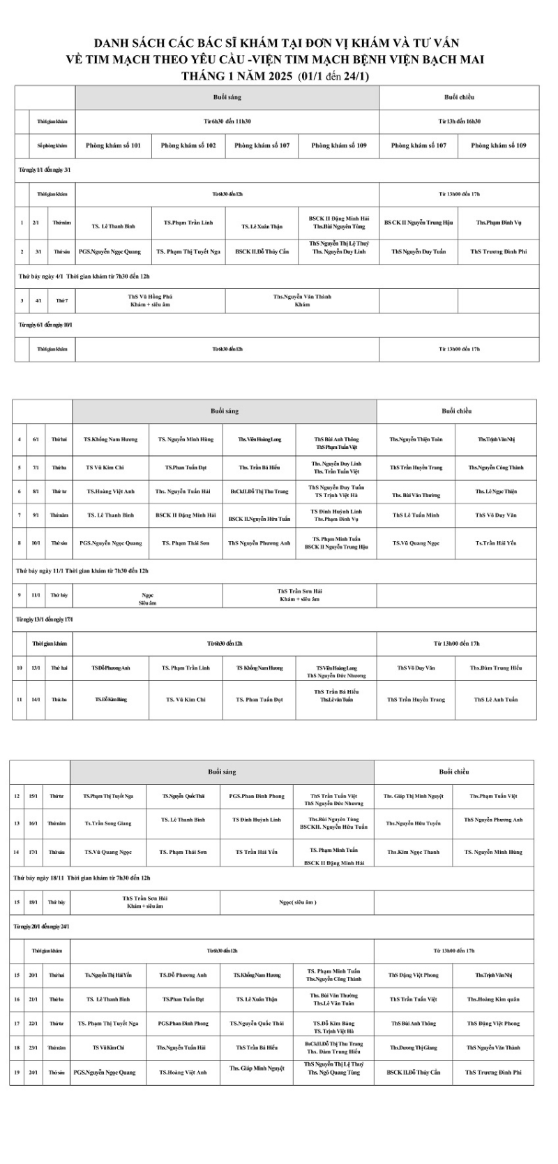 Lịch khám và tư vấn theo yêu cầu tháng 1 - 2025