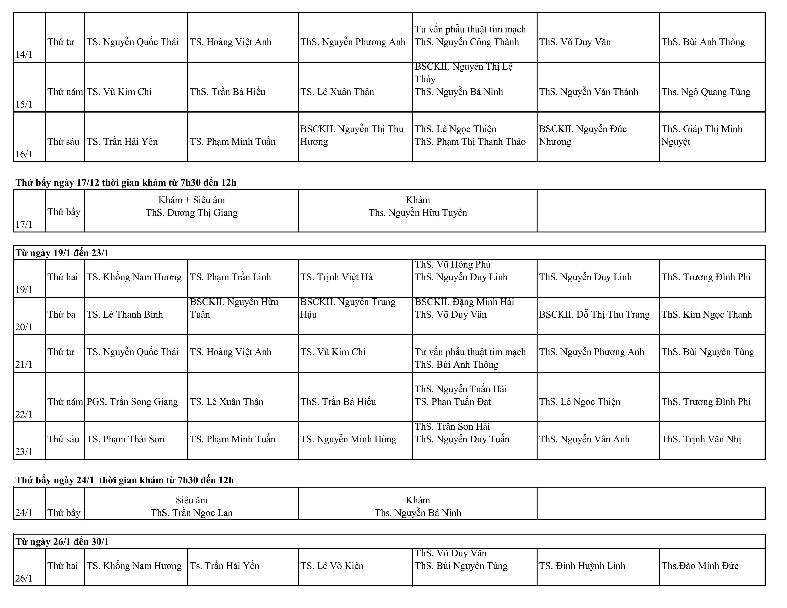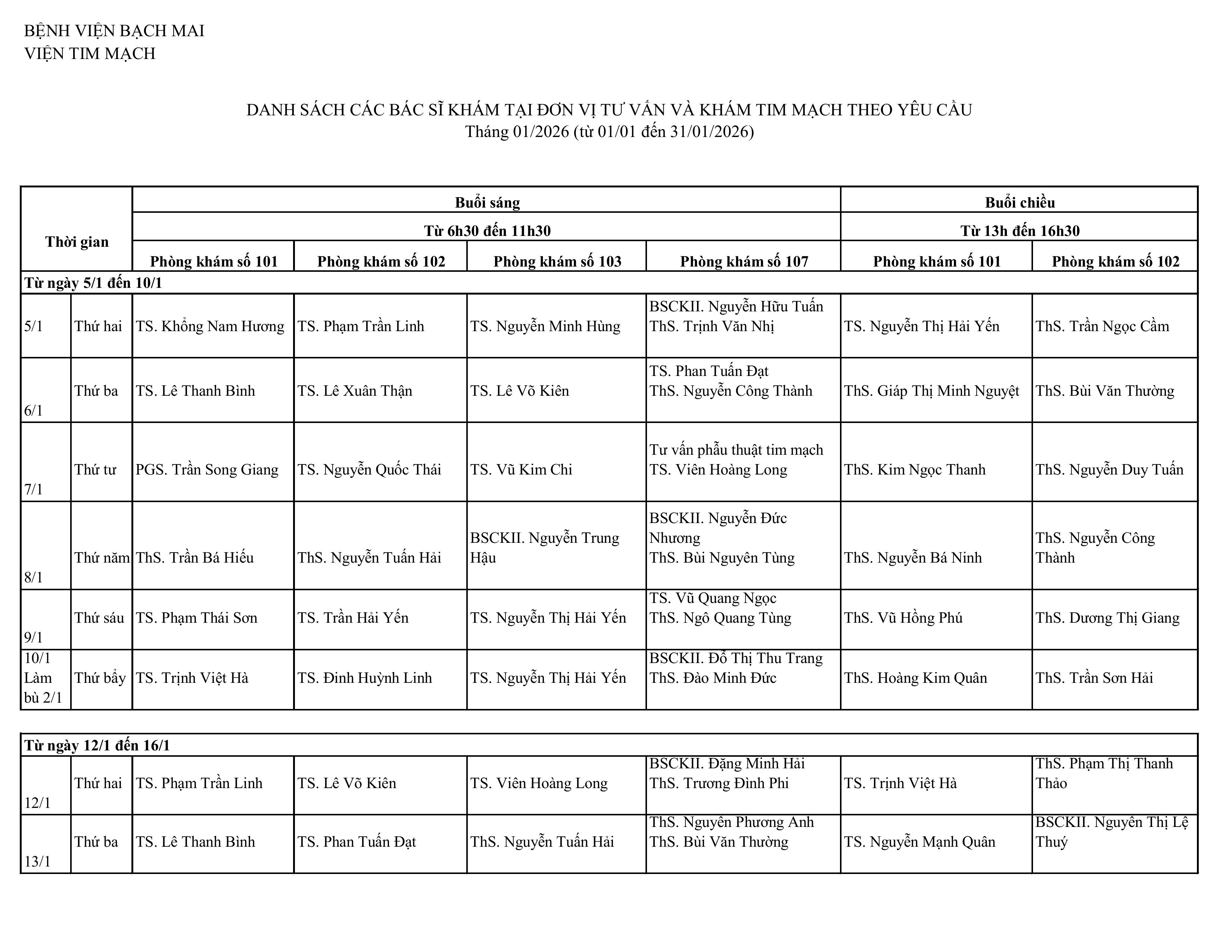 Lịch khám và tư vấn theo yêu cầu tháng 1 - 2026