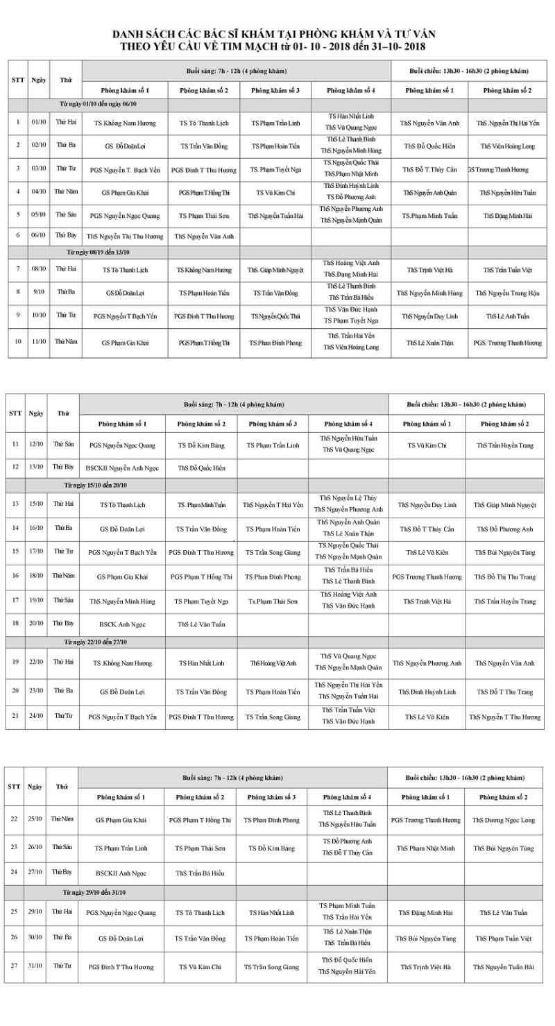 Lịch khám và tư vấn theo yêu cầu tháng 10 - 2018