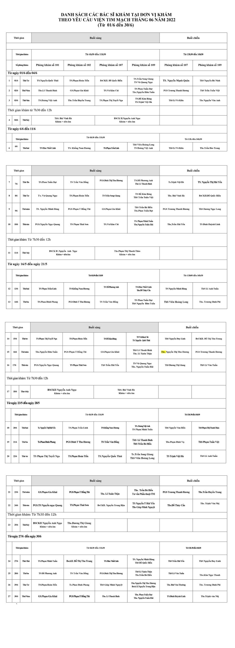 Lịch khám và tư vấn theo yêu cầu tháng 6 - 2022
