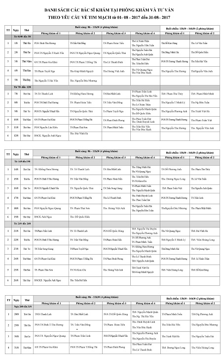 Lịch khám và tư vấn theo yêu cầu tháng 8 - 2017