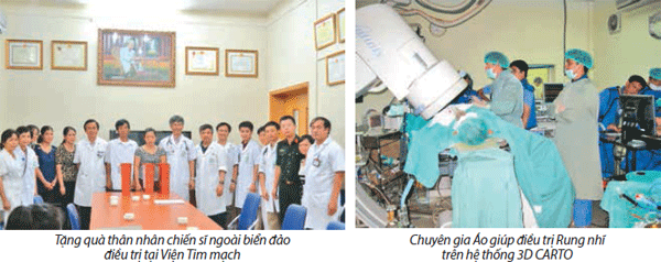 Các cán bộ của Viện cũng tham gia tích cực vào các hoạt động khám từ thiện ở một số nơi như: Ninh Bình, Nam Định, Thanh Hóa, Quảng Bình, Quảng Ngãi, Điện Biên, Hà Giang... Đặc biệt trong ngày tháng 7 vừa qua với tinh thần “hướng về biển đảo quê hương” Viện Tim mạch đã có nhiều hoạt động ý nghĩa: cùng toàn thể Bệnh viện Bạch Mai ủng hộ một ngày lương, ngoài ra Viện đã tổ chức quyên góp được hơn 30 triệu đồng ủng hộ các chiến sỹ cảnh sát biển, kiểm ngư, ngư dân bám biển; khám điều trị miễn phí tại Viện cho các thân nhân, gia đình các chiến sỹ cảnh sát biển và cử đoàn công tác của Viện gần 30 cán bộ đi khám bệnh từ thiện cho gần 400 hộ gia đình ngư dân tại xã Bình Châu, huyện Bình Sơn tỉnh Quảng Ngãi, một xã có tới 791 Liệt sĩ, 99 Bà mẹ Việt Nam anh hùng. 4. Phong trào Văn thể mỹ Viện cũng luôn chú trọng đến Văn hóa cơ quan, chăm lo đời sống vật chất, tinh thần của cán bộ nhân viên trong Viện; kết hợp chặt chẽ chính quyền và công đoàn tổ chức các buổi xem phim, nghỉ mát trong dịp hè. Viện Tim mạch luôn là một đơn vị gương mẫu của Bệnh viện Bạch Mai trong các phong trào thi đua mà Bộ Y tế và Bệnh viện Bạch Mai phát động, luôn tham gia tích cực các phong trào văn nghệ, thể dục thể thao của Bệnh viện như: Cầu lông, Bóng đá, Bóng bàn, Cờ tướng, Kéo co....