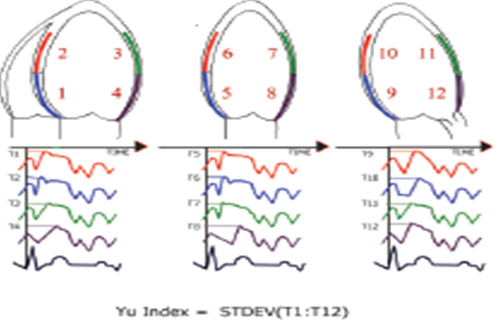 Hình 1. Chỉ số DI (Yu index) đo từ 12 đoạn cơ tim. Đo thời gian đạt vận tốc tâm thu tối đa của từng vùng cơ tim trên SA Doppler mô màu (Ts): khoảng thời gian đo được từ điểm bắt đầu của phức bộ QRS trên điện tâm đồ đến đỉnh vận tốc dương tối đa trong thỡ tõm thu (trong khoảng mở và đóng van động mạch chủ). Nếu không nhỡn thấy vận tốc dương thỡ vựng cơ tim đó sẽ bị loại ra khỏi tính toán. Nếu có nhiều đỉnh trong thỡ tõm thu với vận tốc tương tự nhau thỡ chọn đỉnh sớm nhất. Tiến hành trên 12 đoạn cơ tim (6 đoạn vùng đáy và 6 đoạn vùng giữa ở ba mặt cắt): Hai buồng từ mỏm (thành trước và thành dưới); Ba buồng từ mỏm (thành sau và thành trước-vách); Bốn buồng từ mỏm (vỏch liờn thất và thành bờn thất trỏi) Sử dụng phần mềm QLAP – SQ trên máy siêu âm tự động tính khoảng thời gian chêch lệch giữa các đỉnh vận tốc tâm thu của các vùng cơ tim ở từng mặt cắt (∆Ts). Từ kết quả đo của 12 đoạn cơ tim tính được chỉ số mất MĐBCT (DI - Dyssynchrony Index) là độ lệch chuẩn của thời gian đạt vận tốc tối đa trong thỡ tõm thu của 12 đoạn cơ tim trên (hình 1). Có MĐBCT được xác định theo tiêu chuẩn Yu (Yu Index) khi: ∆Ts ≥ 65ms hoặc chỉ số MĐB ( DI) ≥ 32,6 ms [6]. Xử lý số liệu: Các số liệu của nghiên cứu đều được nhập và xử lý theo các thuật toán thống kê trên máy tính với sự trợ giúp của phần mềm SPSS for Windows version 17.0. (SPSS. Inc South Wacker Drive, Chicago, IL). KẾT QUẢ. 37 bệnh nhân với 24 bệnh nhân nam và 13 bệnh nhân nữ có độ tuổi trung bình 35,3 ± 15,2 năm (trẻ nhất 8 tuổi và lớn tuổi nhất 65 tuổi). Đặc điểm chung của nhóm bn nghiên cứu được trình bày ở bảng 1. Bảng 1. Đặc điểm chung nhóm bệnh nhân nghiên cứu | Các thông số | Trung bình độ lệch chuẩn | Tuổi (năm) | 35,34 ± 15,22 | Giới (Nam/nữ) | 24 nam/13 nữ | ĐTĐ kiểu type A/kiểu type B | 25bn/12bn | Vị trí đường dẫn truyền phụ Trước vách Sau vách Trước bên Bên Sau | 2/37 bn 10/37 bn 6/37 bn 17/37 bn 2/37 bn | Độ rộng khoảng QRS (ms) | 131,72 ± 9,23 | Tần số tim (chu kỳ/phút) | 82.50 ± 11.25 | Đường kính cuối tâm trương thất trái (mm) | 44.93 ±4.83 | Đường kính cuối tâm thu thất trái (mm) | 29.76±3.55 | Thể tích cuối tâm trương thất trái (ml) | 95.93±21.75 | Thể tích cuối tâm trương thất trái (ml) | 35.44±10.47 | Phân số tống máu thất trái (%) | 62.76±5.11 | Chỉ số Tei thất trái. | 0.28±0.38 |