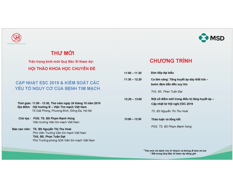 Ngày 24/10/2019 (thứ Năm) Viện Tim mạch Việt Nam phối hợp với công ty MSD tổ chức hội thảo khoa học chuyên đề "Cập nhật ESC 2019 và kiểm soát các yếu tố nguy cơ của bệnh Tim mạch" với sự tham gia của PGS.TS.BS. Phạm Mạnh Hùng - Viện Trưởng Viện Tim mạch Việt Nam, TS.BS. Nguyễn Thị Thu Hoài - Phó Viện Trưởng Viện Tim mạch Việt Nam , ThS.BS. Phan Tuấn Đạt - Phó Trưởng phòng Q3A Việt Nam.