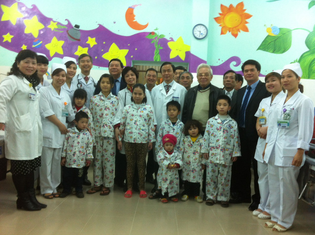 Lãnh đạo BV Bạch Mai và Viện Tim mạch Việt Nam chụp ảnh cùng bệnh nhi trong ngày khai trương Phòng C5. Ảnh: M.Linh