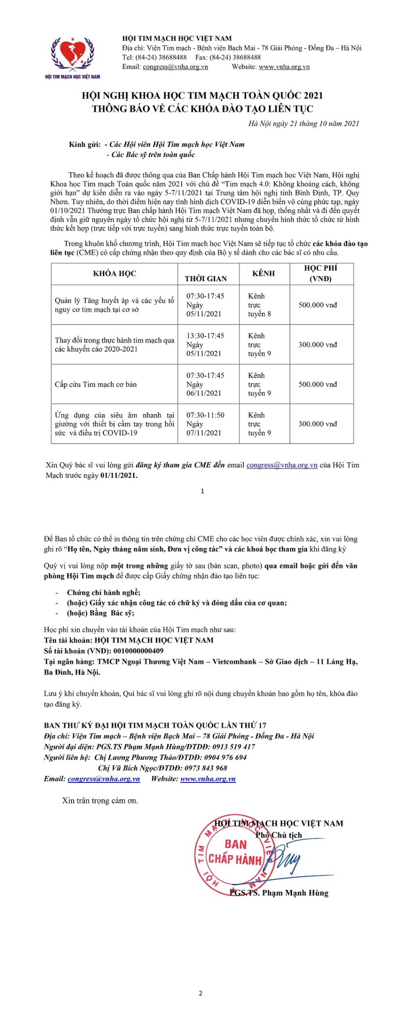 Thông báo các khóa đào tạo liên tục trong Đại hội Tim mạch 2021 Tweet Tải file tại đây: Thong_bao_CME_HNTM_2021.pdf