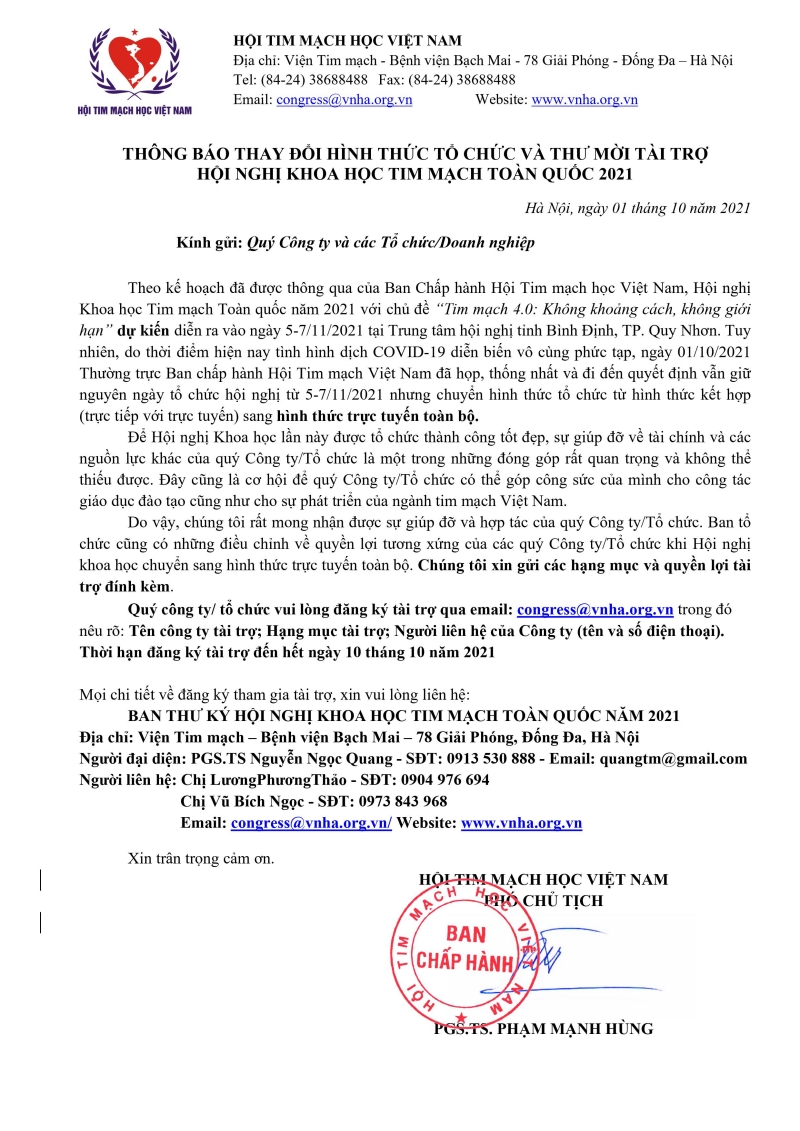 Thông báo thay đổi hình thức và thư mời tài trợ Hội nghị khoa học Tim mạch toàn quốc 2021 Tweet Tải file tại đây: Thong_bao_HNTM_lan4.pdf