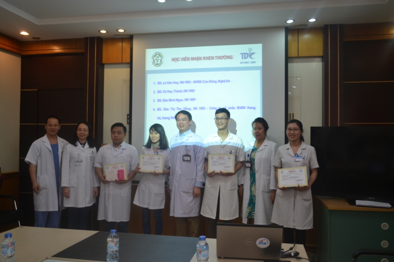 TS. Nguyễn Thị Mỹ Châu - Phó giám đốc Trung tâm đào tạo & Chỉ đạo tuyến trao chứng chỉ cho các học viên của khóa Đào tạo