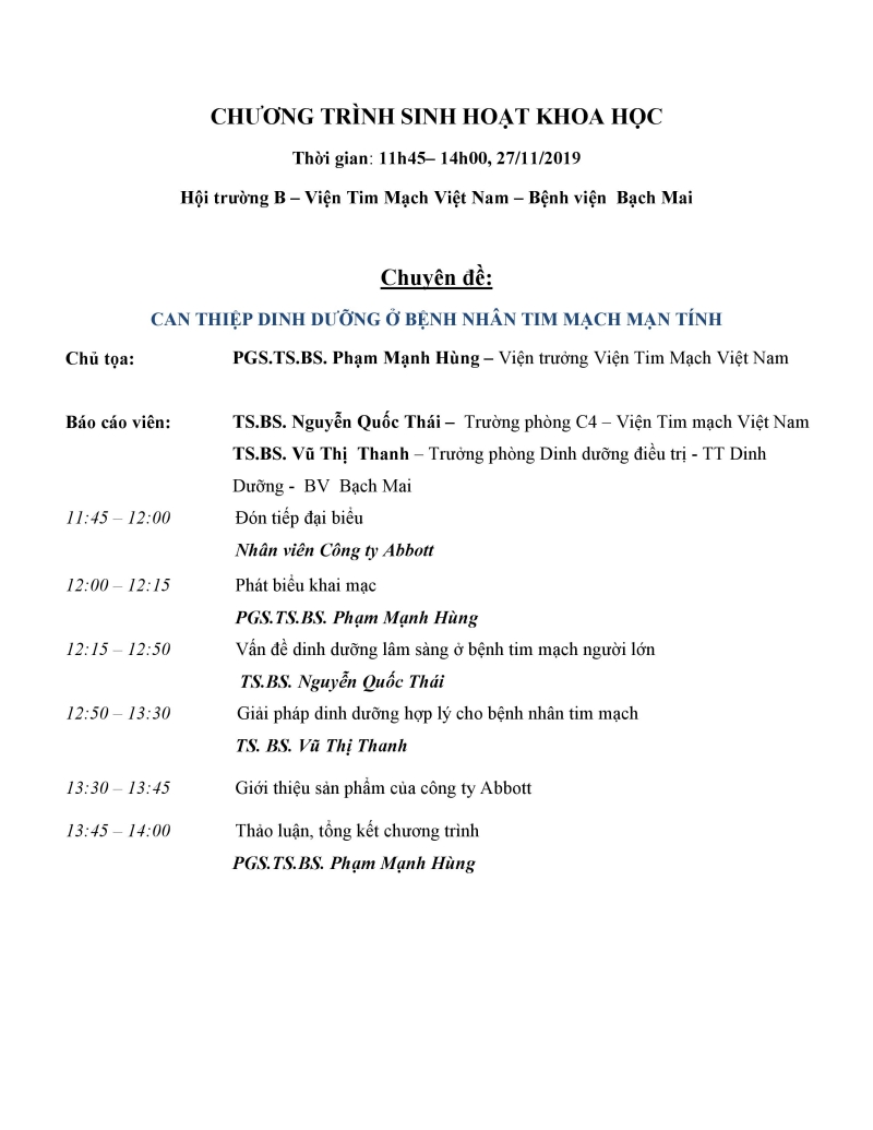 Ngày 27/11/2019 (Thứ Tư) Viện Tim mạch Việt Nam phối hợp với Công ty Abbott tổ chức chương trình sinh hoạt khoa học chuyên đề "Can thiệp dinh dưỡng ở bệnh nhân tim mạch mạn tính" với sự tham gia của các chuyên gia Tim mạch hàng đầu đến từ Viện Tim mạch Việt Nam và chuyên gia dinh dưỡng đến từ Trung tâm dinh dưỡng lâm sàng - Bệnh viện Bạch Mai.