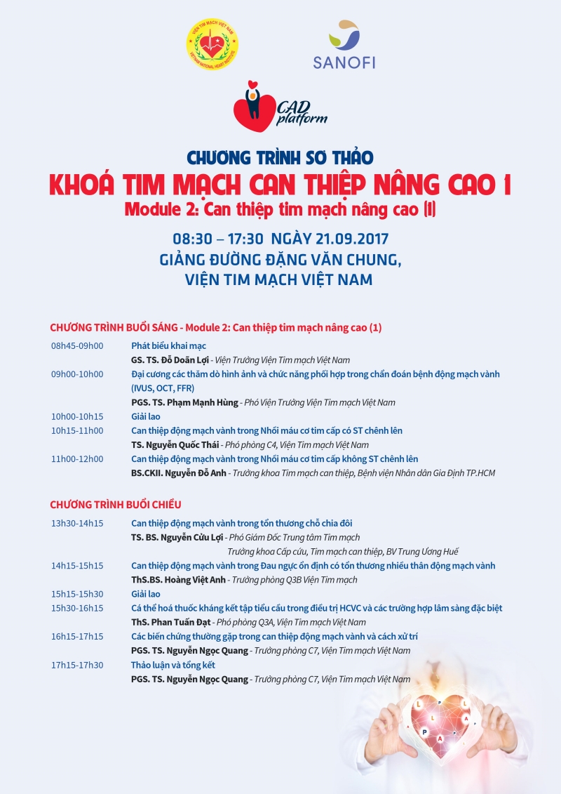 Ngày 21/09/2017 (thứ Năm) tại giảng đường Đặng Văn Chung, Viện Tim mạch Việt Nam phối hợp với hãng Sanofi tổ chức chương trình sơ thảo khóa "Tim mạch can thiệp nâng cao I" với sự tham gia của các chuyên gia Tim mạch hàng đầu đến từ Viện Tim mạch Việt Nam, bệnh viện Nhân dân Gia Định, bệnh viện Trung Ương Huế.