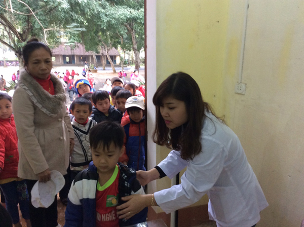 Điều dưỡng Lan Anh trong một buổi thăm khám thiện nguyện cho các em học sinh tiểu học tại trường dân tộc nội trú xã Cát Vân, huyện Như Xuân, tỉnh Thanh Hoá (Ảnh: Thanh Hương).