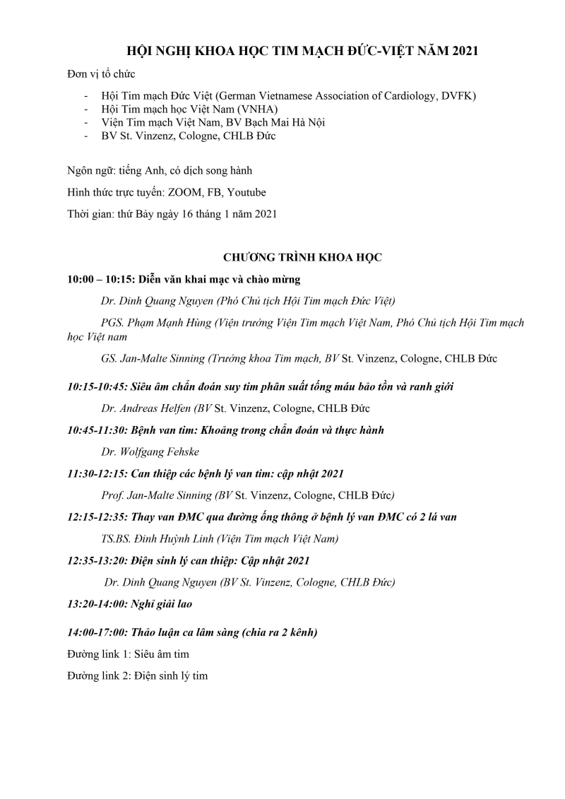 Ngày 16/01/2021 (Thứ bảy) Viện Tim mạch Việt Nam phối hợp với Hội Tim mạch học Việt Nam, Hội Tim mạch học Đức Việt và bệnh viện St.Vinzenz, Cologne, Cộng hòa liên bang Đức tổ chức Hội nghị khoa học Đức Việt năm 2021. Hội nghị sẽ có sự tham gia của các chuyên gia Tim mạch hàng đầu đến từ Việt Nam và Cộng hòa liên bang Đức.