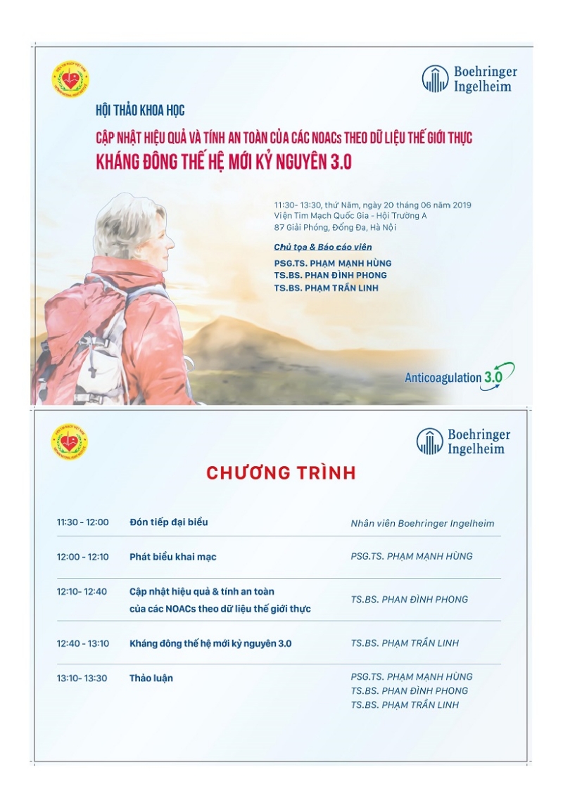 Ngày 20/6/2019 (thứ Năm) Viện Tim mạch Việt Nam phối hợp với hãng Boehringer Ingelheim tổ chức buổi hội thảo khoa học "Cập nhật hiệu quả và tính an toàn của các NOACs theo dữ liệu nghiên cứu thế giới thực - Kháng đông thế hệ mới kỷ nguyên 3.0". Chương trình sẽ có sự tham gia của PGS.TS. Phạm Mạnh Hùng - Viện Trưởng Viện Tim mạch, TS. Phan Đình Phong - Trưởng phòng Q3A Viện Tim mạch, TS. Phạm Trần Linh - Trưởng phòng C5 Viện Tim mạch.