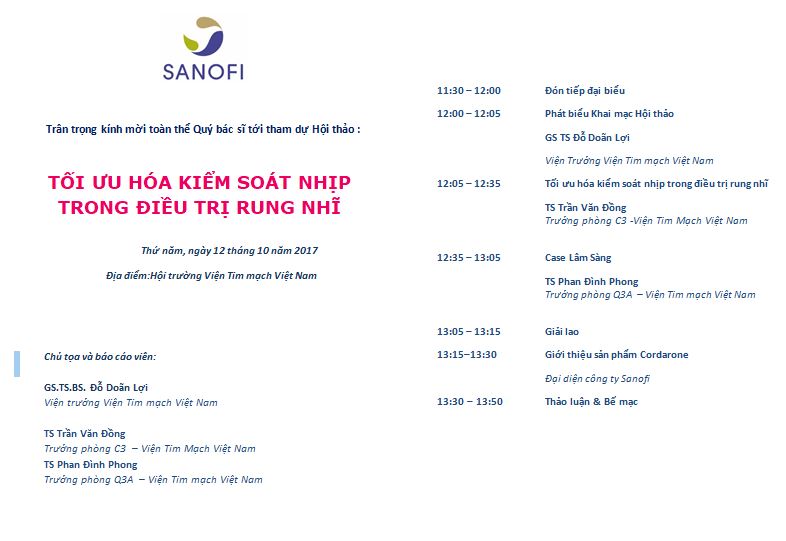 Ngày 12/10/2017 (thứ Năm) Viện Tim mạch Việt Nam phối hợp với công ty Sanofi tổ chức Hội thảo chuyên đề "