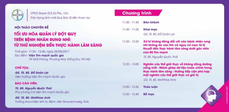 Ngày 5/5 (Thứ Sáu) Viện Tim mạch Việt Nam phối hợp với hãng Bayer sẽ tổ chức hội thảo chuyên đề "Tối ưu hóa quản lý đột quỵ trên bệnh nhân rung nhĩ: Từ thử nghiệm đến thực hành lâm sàng" với sự tham gia của các chuyên gia tim mạch đến từ Viện Tim mạch Việt nam và GS.TS.BS. Matthias Antz trưởng khoa Điện sinh lý, bệnh viện Braunschweig, Đức.