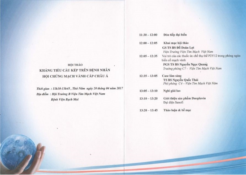 11h30 ngày 20/4/2017 (thứ Năm), Viện Tim mạch Việt Nam phối hợp với hãng Sanofi tổ chức Hội thảo "Kháng tiểu cầu kép trên bệnh nhân hội chứng mạch vành cấp chấu Á" với sự tham gia của các chuyên gia mạch vành hàng đầu đến từ Viện Tim mạch Việt Nam.Trân trọng kính mời quý đồng nghiệp đến tham dự và đóng góp cho hội thảo.