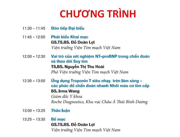 Ngày 19/10 (thứ Năm) Viện Tim mạch Việt Nam, Hội Tim mạch học Việt Nam phối hợp với hãng Roche tổ chức hội thảo khoa học "Các dấu ấn sinh học trong hội chứng mạch vành cấp và suy tim" với sự tham gia của GS.TS. Đỗ Doãn Lợi Viện trưởng Viện Tim mạch Việt Nam, TS.Nguyễn Thị Thu Hoài phó Viện trưởng Viện Tim mạch Việt Nam và bác sĩ Ir MaWang Giám đốc phòng Nghiên cứu khoa học và y học Roche Dianositics Châu Á Thái Bình Dương.