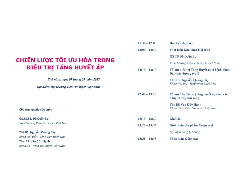 Ngày 07/09/2017 (Thứ Năm) Viện Tim mạch Việt Nam phối hợp với hãng Sanofi Hội thảo khoa học "Chiến lược tối ưu hóa trong điều trị tăng huyết áp"với sự tham gia của ThS. BS. Văn Đức Hạnh - Viện Tim mạch và ThS.BS. Nguyễn Quang Bảy - Khoa Nội tiết bệnh viện Bạch Mai.