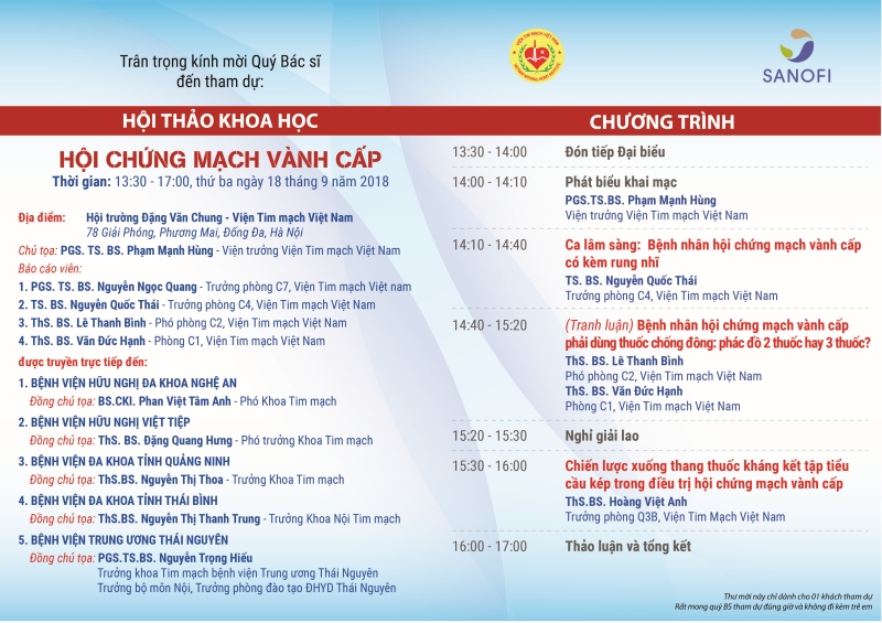 Tiếp nối thành công của ba kì Hội thaỏ trước, ngày 18/09/2018 (thứ Ba) Viện Tim mạch Việt Nam phối hợp với hãng Sanofi tổ chức Hội thảo khoa học kỳ IV với chủ đề "Hội chứng mạch vành cấp" với sự tham gia của các chuyên gia tim mạch hàng đầu đến từ Viện Tim mạch Việt Nam và Trường Đại học Y Hà Nội.